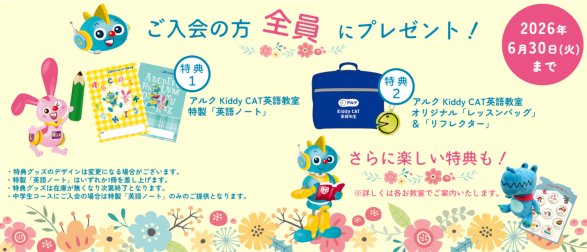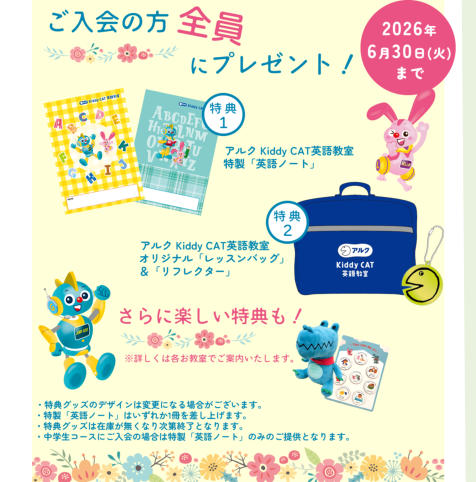 ※他のアルクKiddyCAT英語教室でも同様の特典がある場合もあります。 ※当教室の特典を受けるには、当教室のお申し込みフォームから体験レッスン  をお申し込みください。